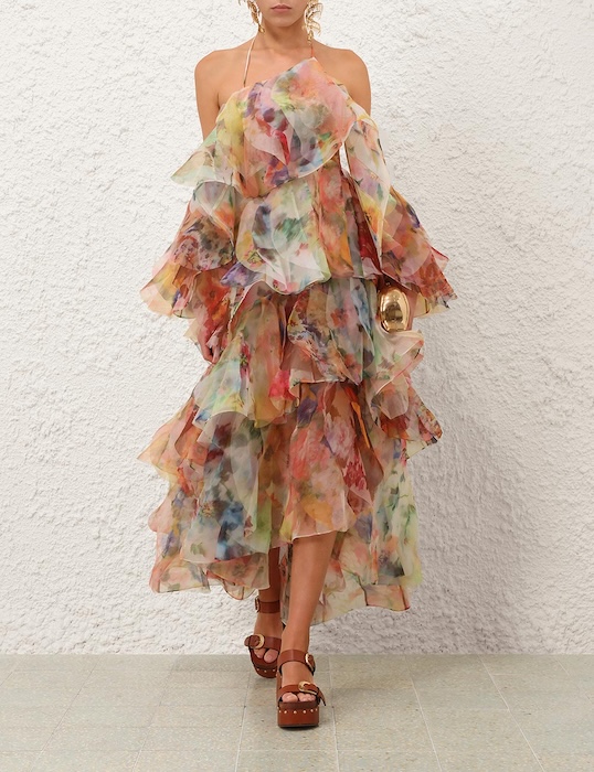 This billowy gown perfectly embodies the Zimmermann brand. With a bold print and tiered ruffles, this dress brings the drama when you walk into any room.